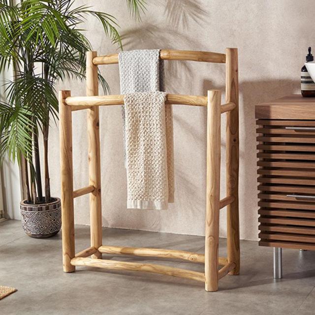 高さ違いの2本のバーにより、省スペースながら複数のタオルを掛けられ、実用性も抜群です。表面はワックス仕上げで、チーク材ならではの自然な木目や肌触りを最大限に引き出しています。