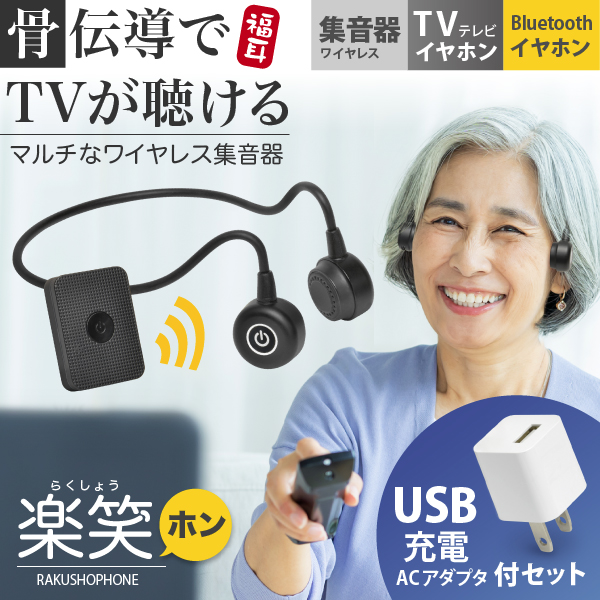 (USB充電アダプタ付) 集音器 骨伝導 ワイヤレス テレビ イヤホン 福耳 楽笑ホン (らくしょうほん) コンセントから充電するアダプタ付