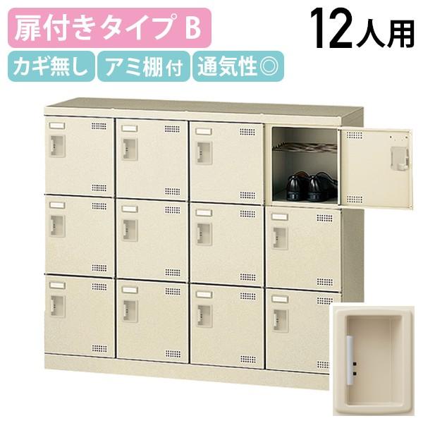 扉付きシューズロッカー Bタイプ 4列3段 12人用 錠無し W1100 D350 H945 スチール アミ棚 名札差し付き ニューグレー KSLB-M412-K2 872316 代引不可 法人宛限定