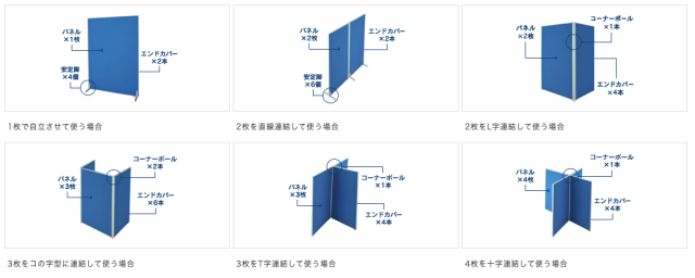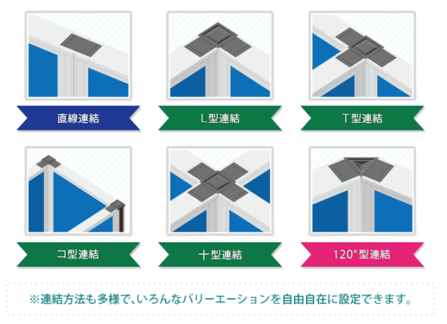 カンタンに組立てられることも、カグクロのローパーテーションの魅力です。 直線連結・L字連結・T字連結・十字連結・T字落差連結・L字落差連結・120度3方向連結・120度2方向連結に対応しています。 ツメを引っ掛けるだけのカンタン連結ですので、2人いれば模様替えも可能です。