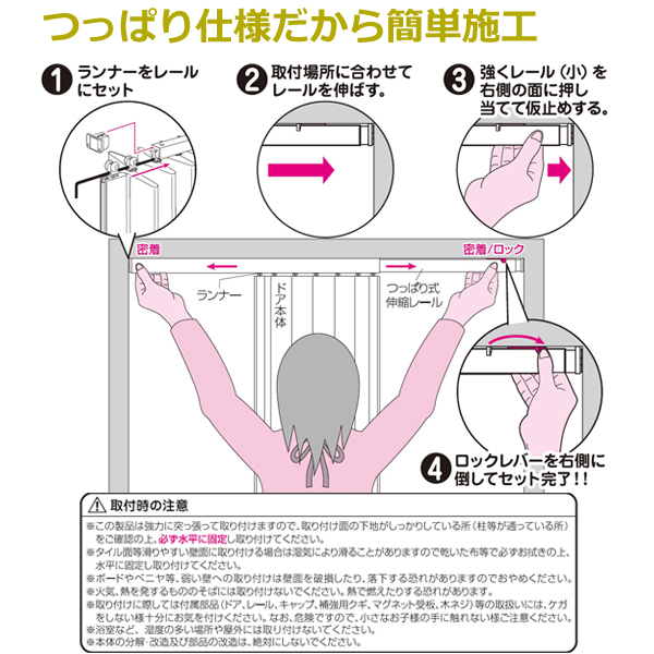 ●既存の空間に簡単に取り付け※できる、つっぱり式のアコーディオンドアの木目調タイプです。 ●窓はもちろん、部屋と部屋、部屋と廊下などを、つっぱり式で手軽に間仕切ることが可能です。 ●面倒な工事もいらず、つっぱり棒を付けるような感覚で、取り付け幅に合わせてレバーをロックするだけ。 ●レールはアルミ製で軽く、一人でも設置可能。 ●冷暖房効率のアップによる省エネ・節電だけでなく、食事等の匂いの軽減や目隠しなど、幅広い効果が期待できます。 ●取り付けの条件を備えた壁さえあれば、社内のオープンスペースだった場所を簡単に個室仕様に変更できます。 ●大型の取っ手がついており、開け閉めもしやすいです。 |
