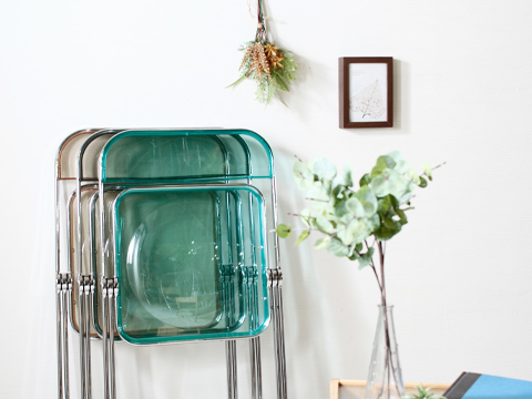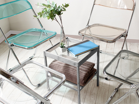 クリア素材を取り入れる事で、空間にスタイリッシュな印象を与えてくれる、スケルトンカラーのパイプ椅子です。