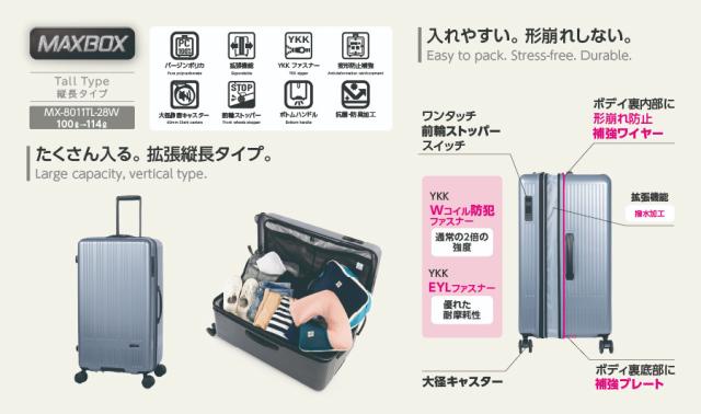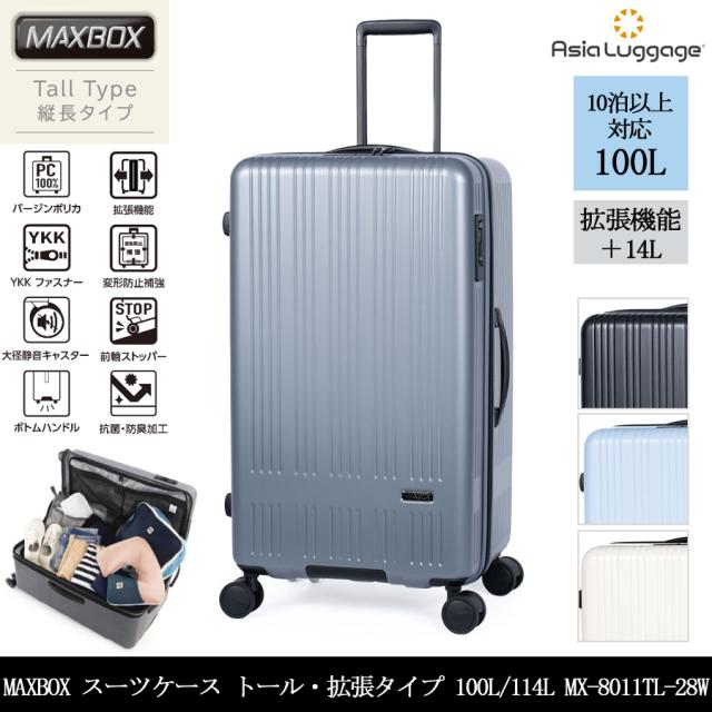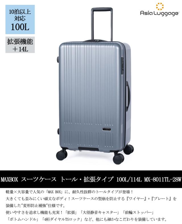 【特大サイズ※無料預入不可】【送料無料】アジアラゲージ MAXBOX 縦長タイプ ジッパーキャリー スーツケース MX-8011TL-28W 100L/114L 拡張機能 大容量 静音キャスター 10泊以上