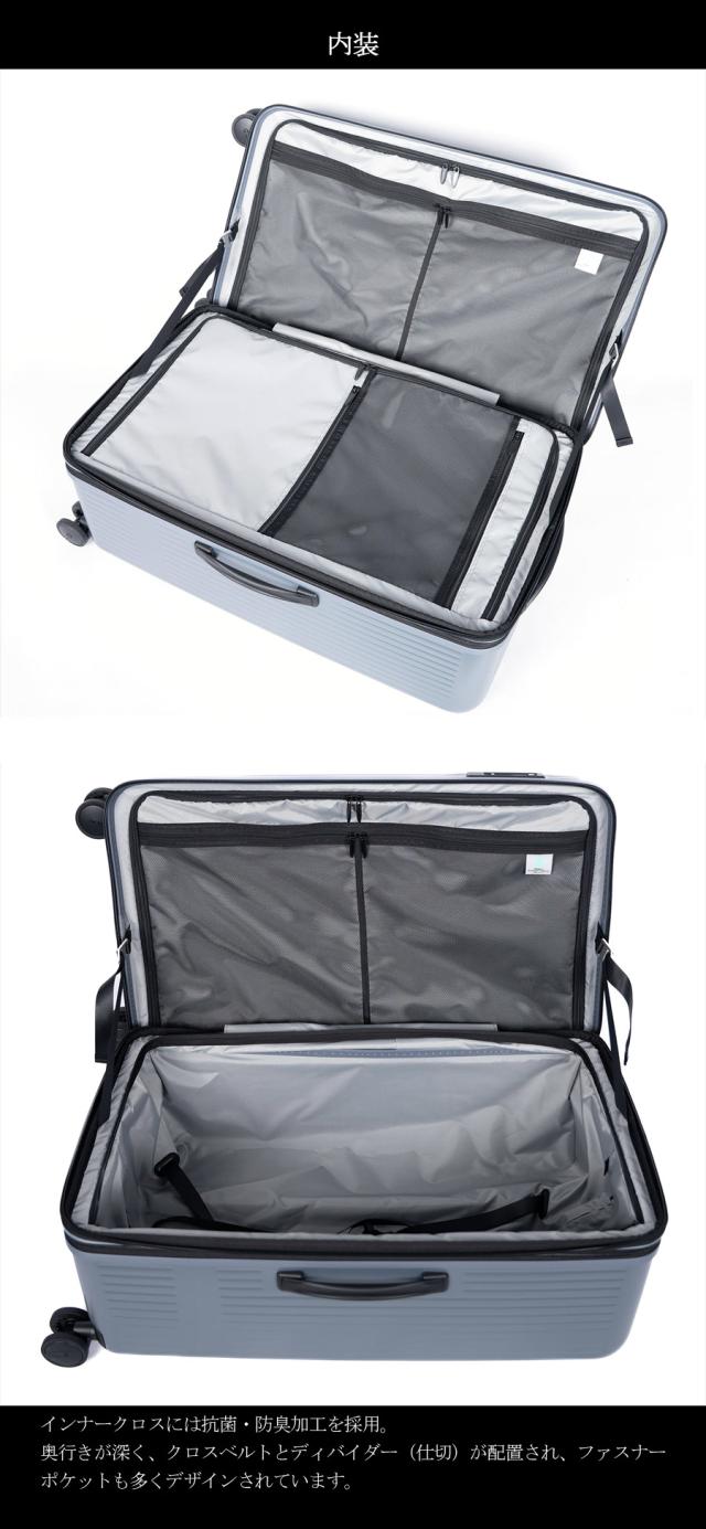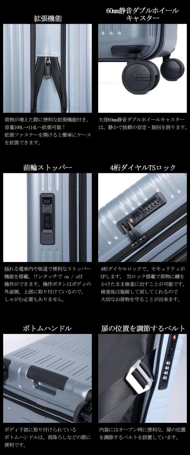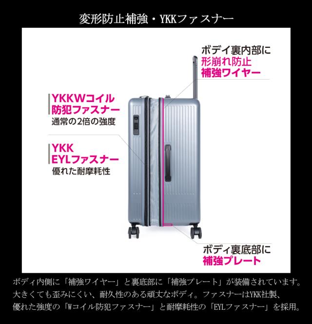 備考:高純度ポリカーボネイト100% / 大径静音キャスター / 拡張機能搭載 / 前輪ストッパー / 変形防止補強/ YKK社製ファスナー / TSロック /抗菌・防臭加工 / ボトムハンドル