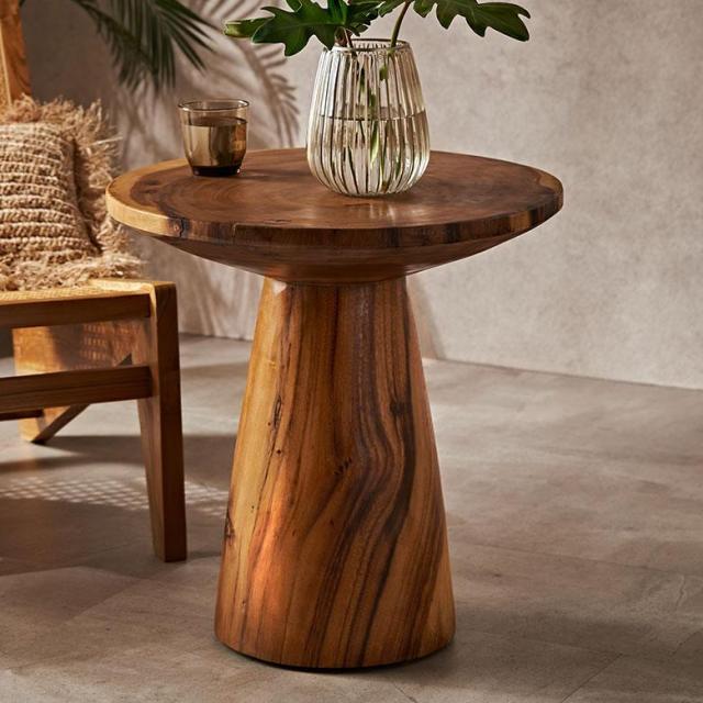 ナチュラルな素材を活かしたデザインは、ワックス仕上げで深みと重厚感を演出。高さ約50cmでホテルのラウンジテーブルやショップやレストランのカフェテーブルにぴったりのサイズ感です。重さ約13kgの安定感のある作りで、観葉植物や花瓶を飾るプランター台や、店舗用ディスプレイにも適しています。単品使いはもちろん、モンキーポッドの丸太から削り出されたフチ付き天板のローテーブルや、スツールにもなるサイドテーブルと複数使いしたワンランク上のコーディネートもお楽しみいただけます。シンプルながらオブジェのような存在感のあるサイドテーブルは、空間に自然の美しさと彩りをプラスします。