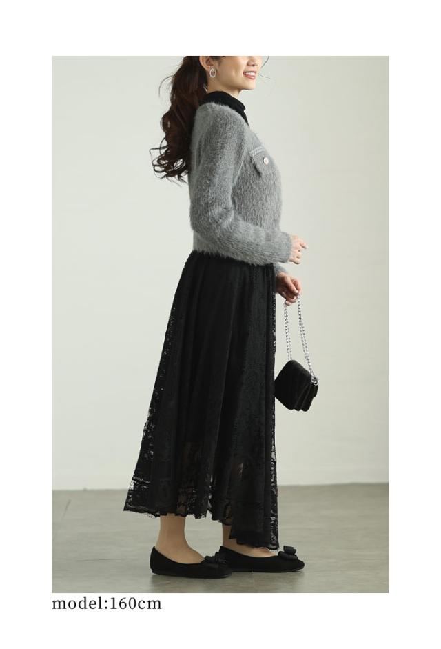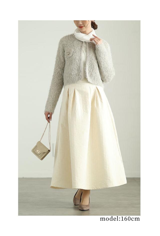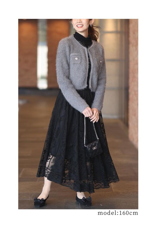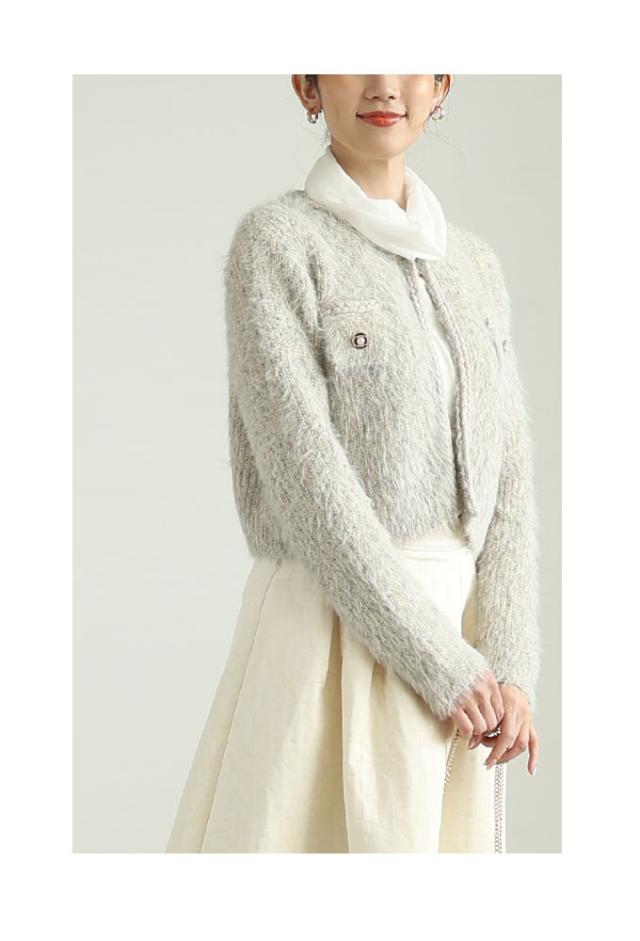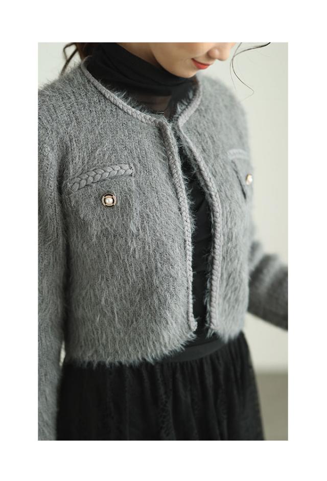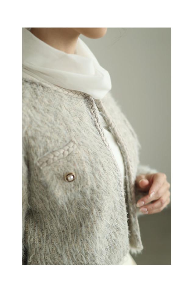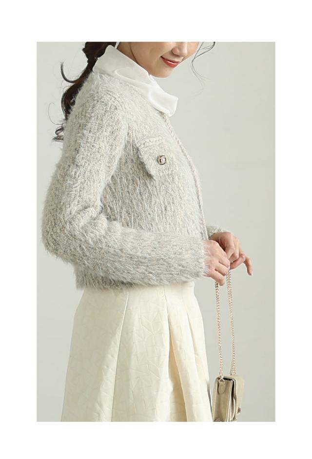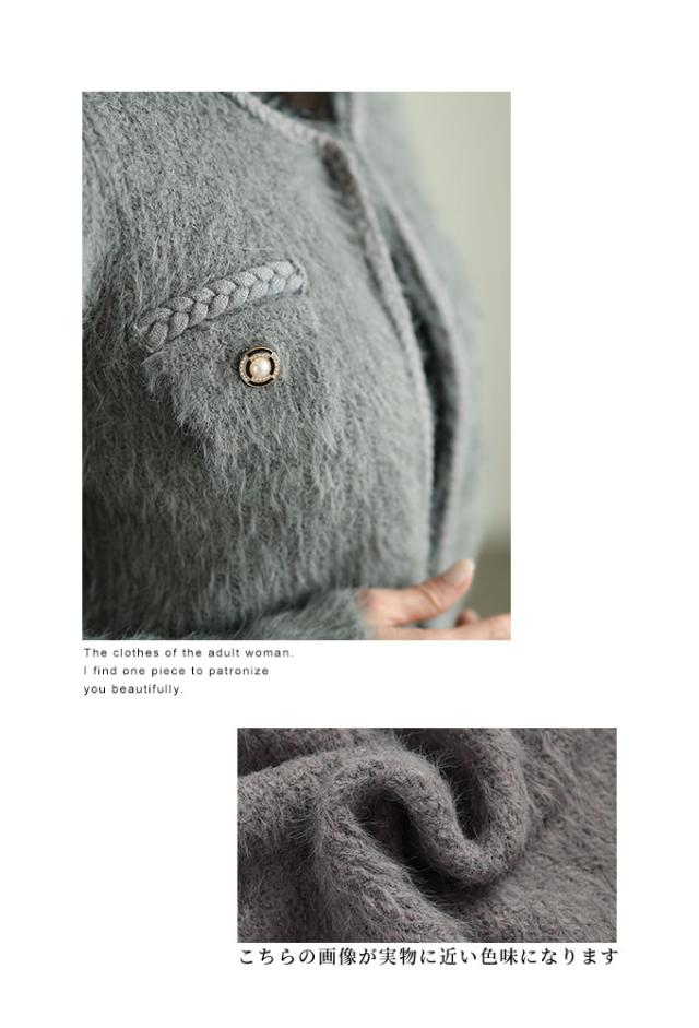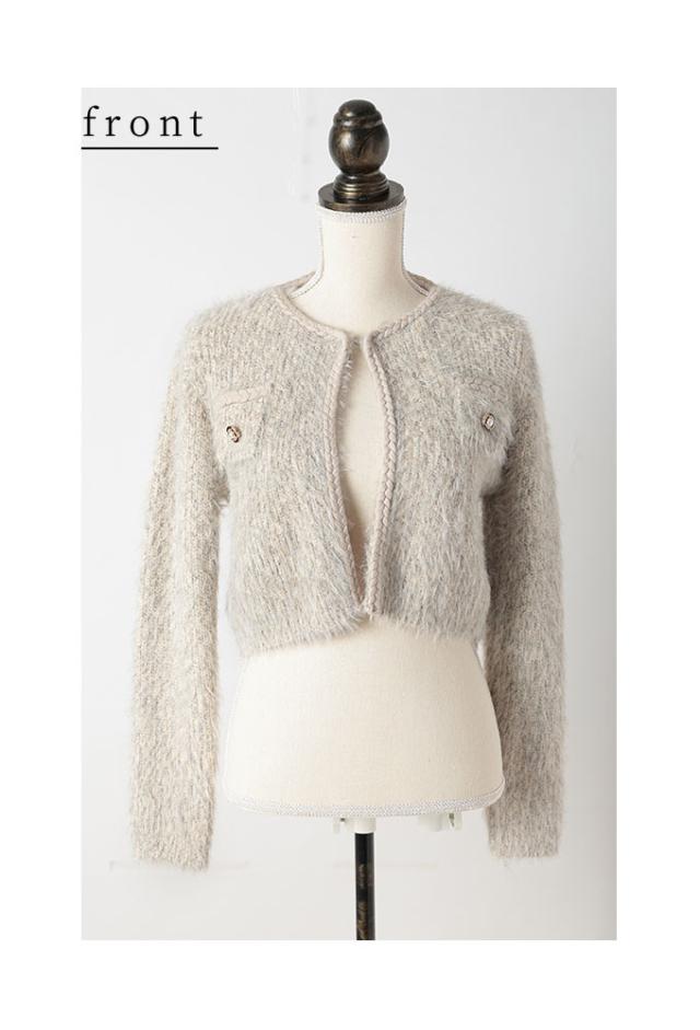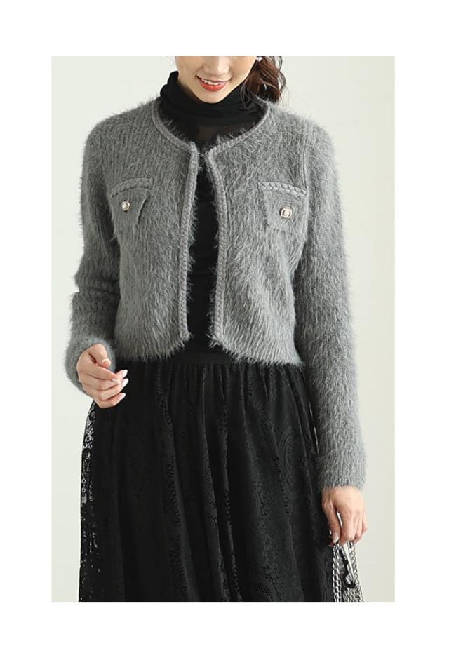 着丈はおへそのやや下くらい、袖丈は手の甲がほぼ隠れるくらいです。毛足の長い柔らかなニットジャケットです。チクチクはありません。フロントホック1つ留め、身頃は程よくゆとりがあります。三つ編み風ブレードもニットで柔らかく、飾りポケットのフラップ部分はビジューボタンがキラキラと華やかです。ショート丈なのでボトムとのバランスが取りやすく、コートも羽織れる程よいボリューム感でした。