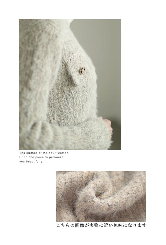 着丈はウエストぐらいです。首元は鎖骨が半分見えるくらいのラウンドネックです。袖は指先が見えるくらいです。脇ぐりも身幅も程よい余裕があり、全体的にちょうどいいサイズ感でした。前はホックが一番上にあるだけなのでさっと羽織れるのがいいですね。毛足の長いフェザーニットで暖かく肌ざわりも良かったです。