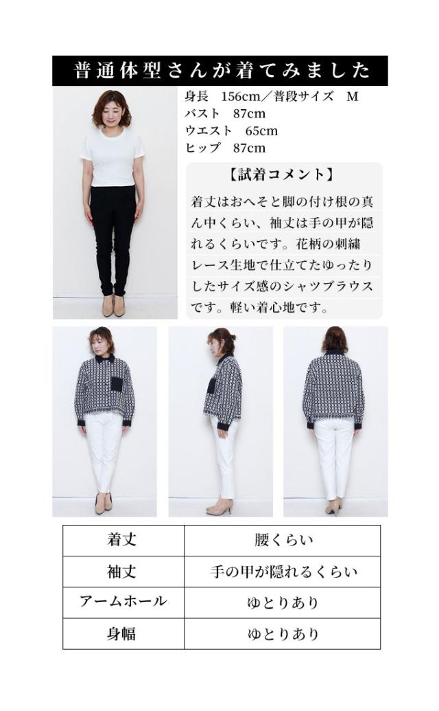着丈はおへそと脚の付け根の真ん中くらい、袖丈は手の甲が隠れるくらいです。花柄の刺繍レース生地で仕立てた、ゆったりしたサイズ感のシャツブラウスです。カフスの袖口もゆったりしています。サラッと肌触りのコットン素材で、軽い着心地です。全体に透け感があるのでインナー必須です。