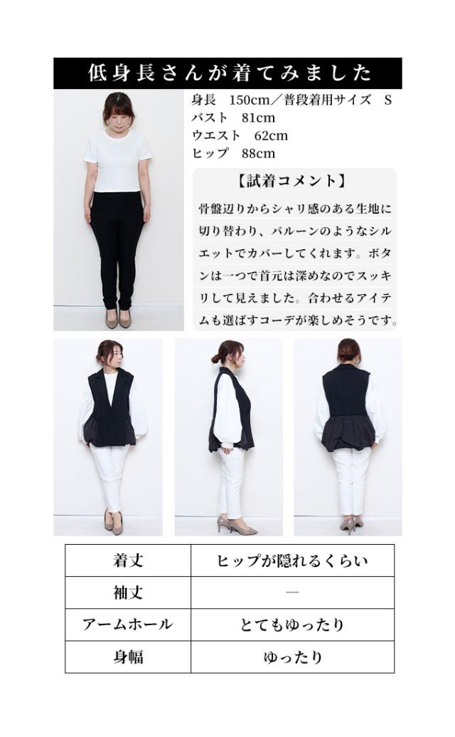 着丈はおしりが隠れるくらいです。脇グリはとても広くボリューム袖のインナーでも楽に着用出来ます。サイドの骨盤辺りからシャリ感のある生地に切り替わり、バルーンのような丸みを帯びたシルエットで気になる部分をカバーしてくれます。ボタンは一つで首元は深めなのでスッキリして見えました。合わせるアイテムも選ばすコーデが楽しめそうです。