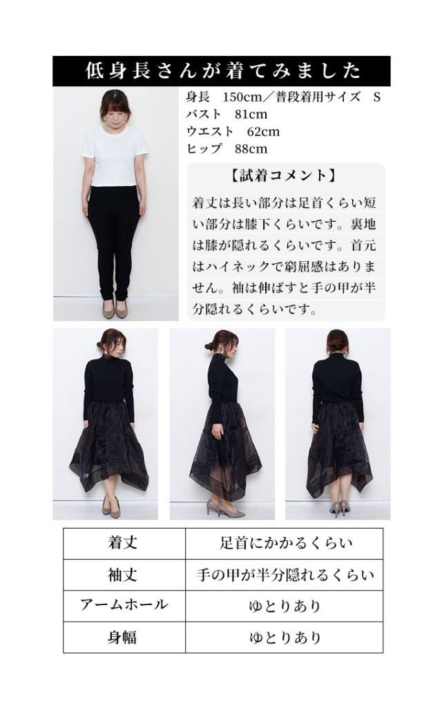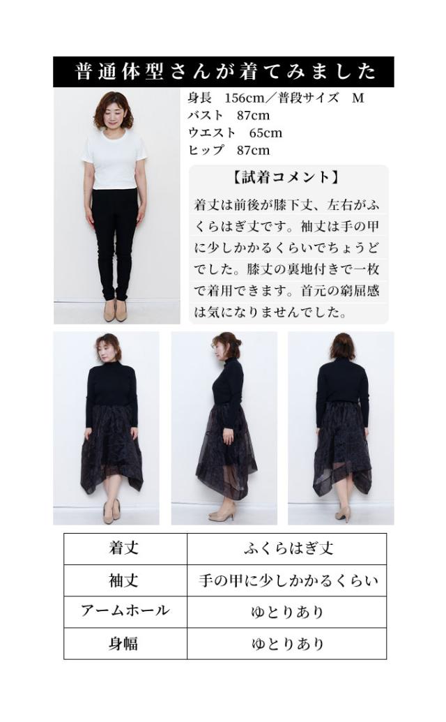 着丈は前後が膝下丈、左右がふくらはぎ丈です。袖丈は手の甲に少しかかるくらいでちょうどでした。チクチク感がなく柔らかなハイネックリブニットのトップスと、透け感と光沢感が軽やかなオーガンジーのふんわりスカートのドッキングワンピです。膝丈の裏地付きで一枚で着用できます。サイドのパイピングのデザインポケットは幅広で浅く透け感があるのであまり実用的ではないです。ハイネックはフィット感がありますが首元の窮屈感は気になりませんでした。