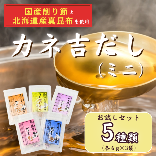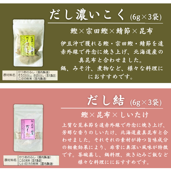■内容量:だし濃いこく(6g×3パック)×1袋・だし雅(6g×3パック)×1袋・だし香(6g×3パック)×1袋・だし結(6g×3パック)×1袋・だし恵(6g×3パック)×1袋