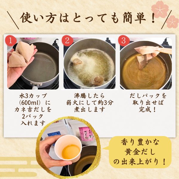 ●だし結:かつおのふし(国内製造)、こぶの粉末(国内製造)、しいたけの粉末(国内製造)
