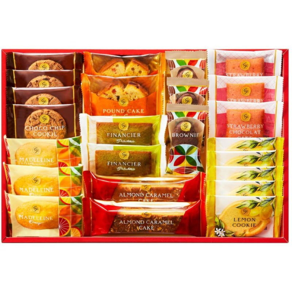 商品:レモンクッキー×5、チョコチップクッキー×4、オレンジマドレーヌ・ストロベリーショコラケーキ・ブラウニー×各3、ピスタチオフィナンシェ・ブラウンシュガーパウンドケーキ・アーモンドキャラメルケーキ×各2【化粧箱入】