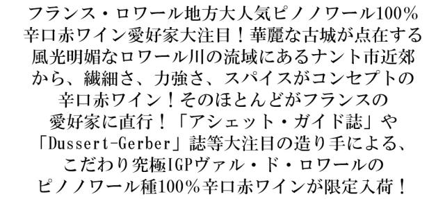 フランス・ロワール地方大人気ピノノワール100%辛口赤ワイン愛好家大注目!華麗な古城が点在する風光明媚なロワール川の流域にあるナント市近郊から、繊細さ、力強さ、スパイスがコンセプトの辛口赤ワイン!そのほとんどがフランスの愛好家に直行!「アシェット・ガイド誌」や「Dussert-Gerber」誌等大注目の造り手による、こだわり究極IGPヴァル・ド・ロワールのピノノワール種100%辛口赤ワインが限定入荷!