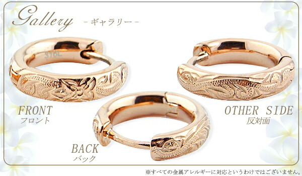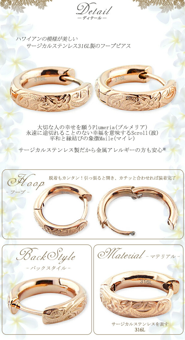 | 商品名 | ハワイアンジュエリー ハワイアン ピアス 大きさが選べる Sサイズ Mサイズ Lサイズ フープピアス ステンレス サージカルステンレス プルメリア スクロール ローズゴールド |