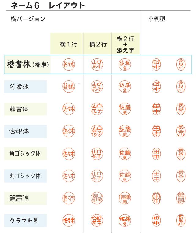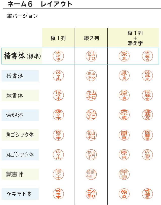 タテ1行(姓or名)・タテ2行(姓名)・タテ1行姓+名1文字小添え・ヨコ1行(姓or名)・タテ2行(姓名)・タテ1行姓+名1文字小添 など自由に配置できます。