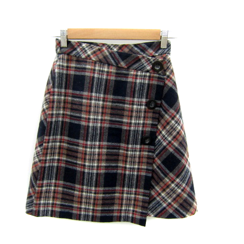 【中古】リランドチュール 台形スカート ラップスカート風 ひざ丈 チェック柄 0 紺 ネイビー グレー レディース