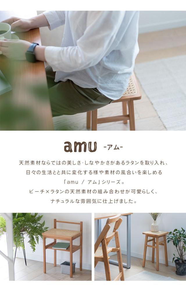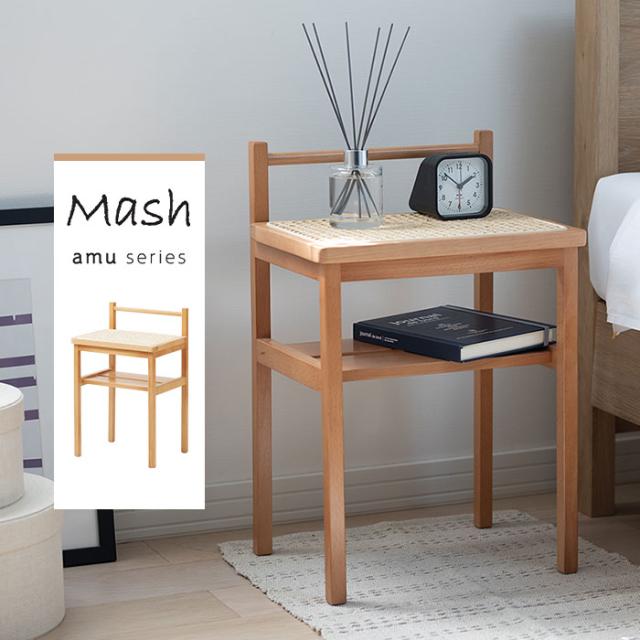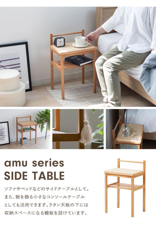 | AMU SIDE TABLE あたたかみのある天然素材のサイドテーブル。 コンパクトなサイズ感で場所を取らずにお部屋に置いておけ、家中あちこち持ち運んでも負担にならない軽量さ。 天板の背面の貫は、置いたものをそっと支えてくれ、持ち運びの際は取っ手としても使えます。 ラタン天板の下には収納スペースになる棚を設け、読みかけの本、家計簿、リモコン、出しっ放しにしたくないティッシュボックスの定位置にするのも◎ また、物を飾る小さなコンソールテーブルとしても活用できます。 赤みがかったクリーム色のビーチ材にラタンという異なる自然素材の組み合わせ。 レトロ感漂うかごめ編みを取り入れ、シンプルで軽やかなデザインに仕上げました。 |
