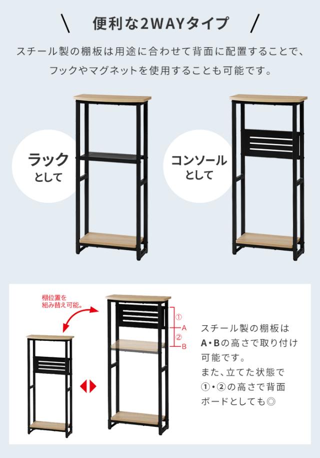 | 落ち着いた木目調天板に淡いブラックのフレームを合わせたモダンなコンソールテーブル。 用途に合わせて棚板を自由に配置することができます。 ボード面には傷や熱、汚れに強いメラミン化粧板を採用することでお手入れも簡単。 上下の棚の位置は130mmピッチで調節可能。 スチール棚は背板として縦に設置してフックなどを掛けることもできます。 |