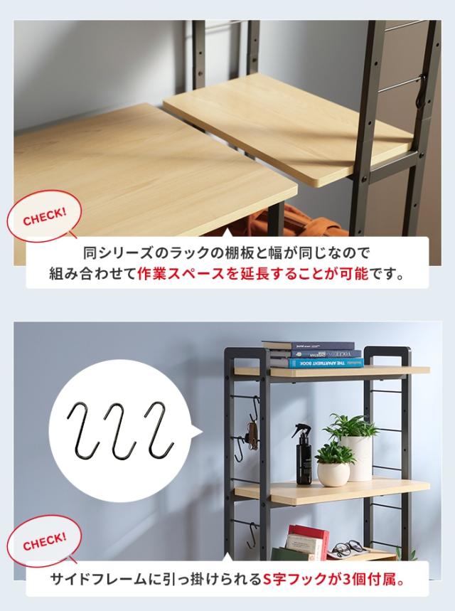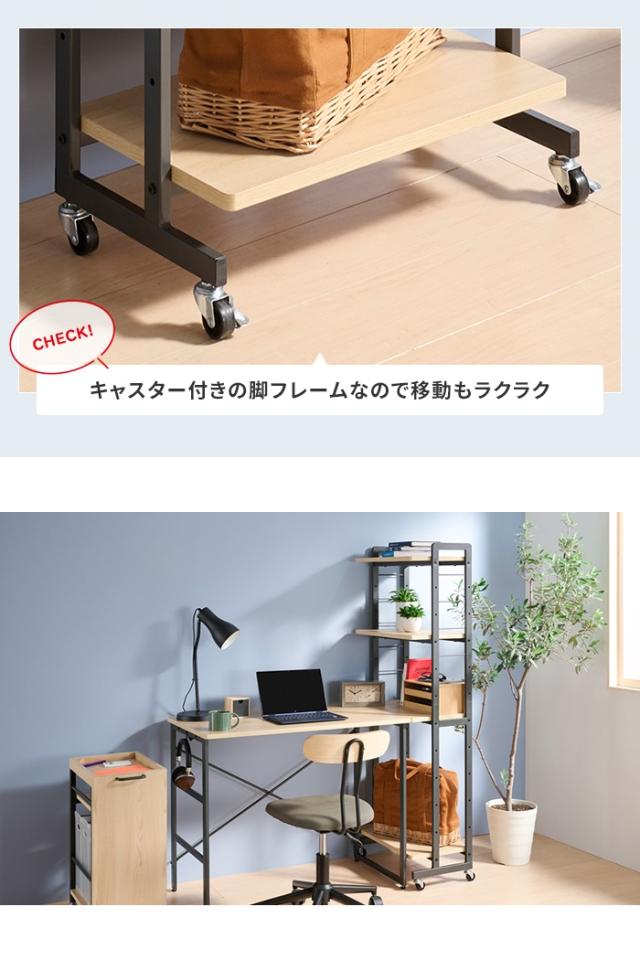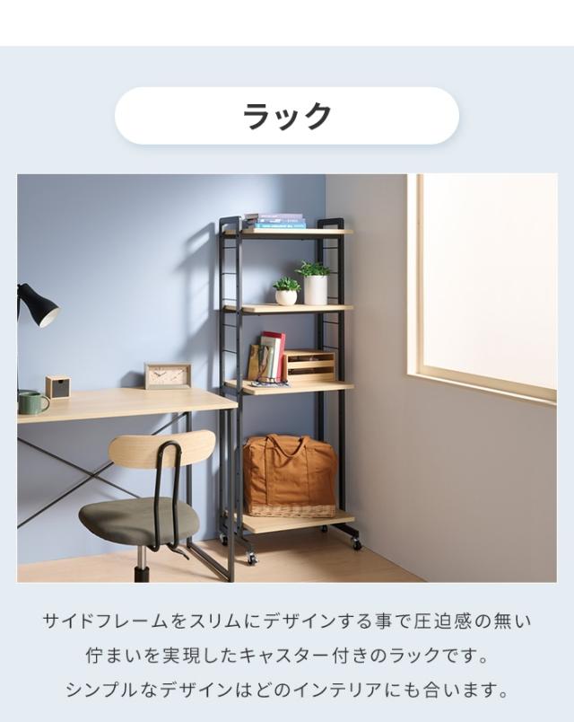 | 落ち着いた木目調天板に淡いブラックのフレームを合わせたモダンなラック。 サイドフレームをスリムにデザインする事で圧迫感の無い佇まいを実現。 棚板の高さを115mmピッチで調節できるので、同シリーズのデスクの天板と棚を合わせてデスクの作業スペースを延長することも可能です。 ボード面には傷や熱、汚れに強いメラミン化粧板を採用することでお手入れも簡単。 キャスター付きで移動もラクラク、ストッパーで固定することもできます。 かばんなどをサッと掛けておくのに便利なS字フックも付属しています。 同シリーズのデスクやワゴンと揃えても◎ |