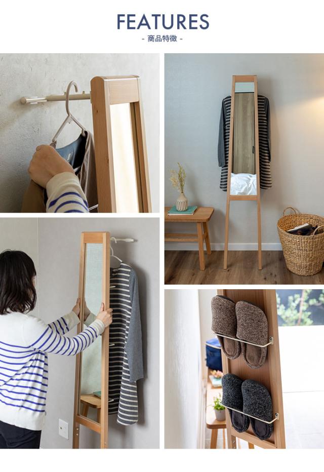 立て掛けミラー 収納付き 幅31 ハンガーラック スタンドミラー 省スペース 洋服掛け 木製 飛散防止加工 ナチュラル おしゃれ