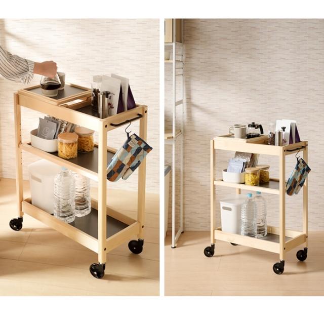 気分に合わせて変えられるリバーシブル棚板がおしゃれなキャスター付き木製ワゴン。