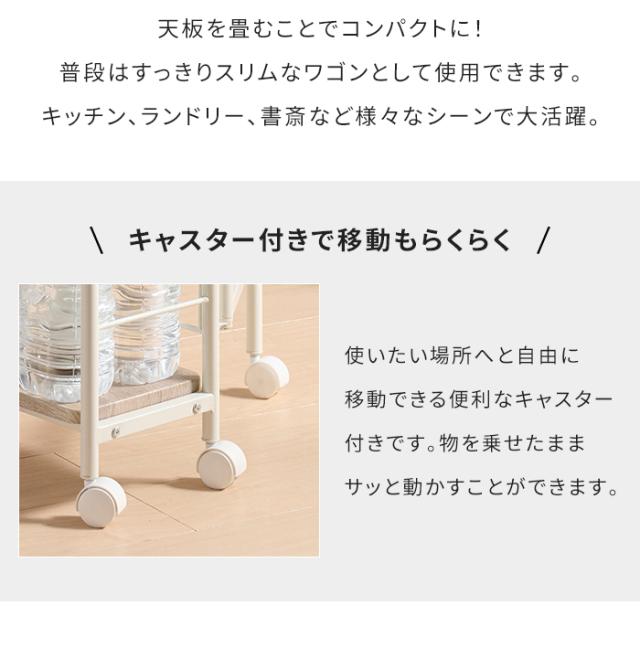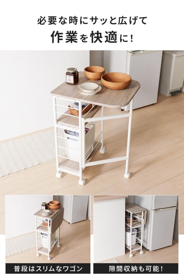 天板をたためばスリムワゴンに、広げれば作業スペースを拡大できる便利なキッチンワゴン。