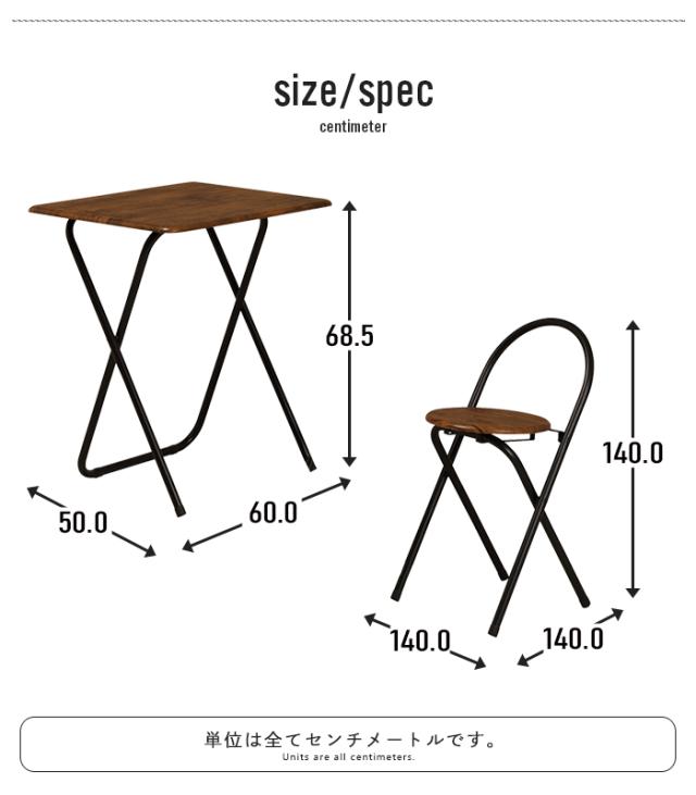 | 幅60×奥行50×高さ68.5cm テーブル折り畳み時:幅60×奥行45×高さ84cm チェア:幅36×奥行41×67cm チェア折り畳み時:幅36×奥行5.5×高さ77.5cm |