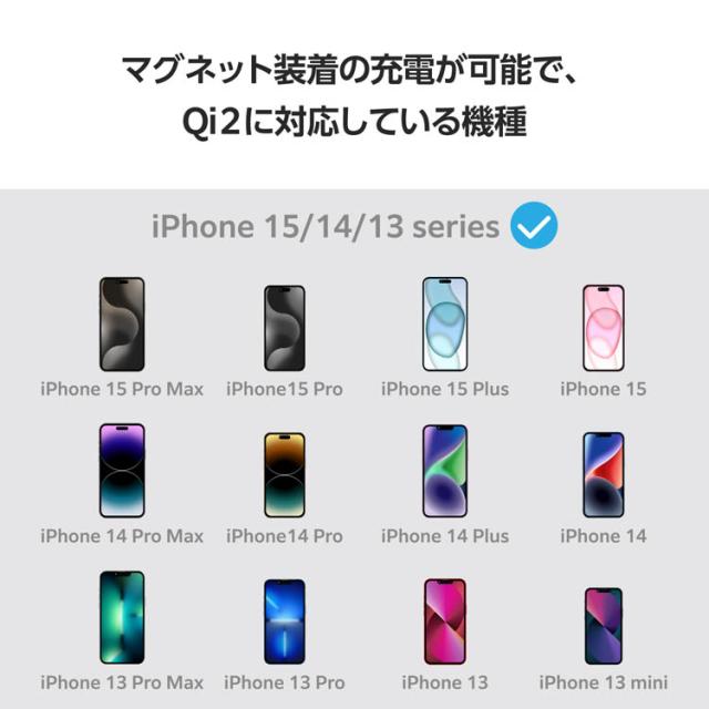 ●マグネットでQi2対応スマートフォンに固定するだけで高速充電できる、Qi2規格対応のワイヤレス充電器です。