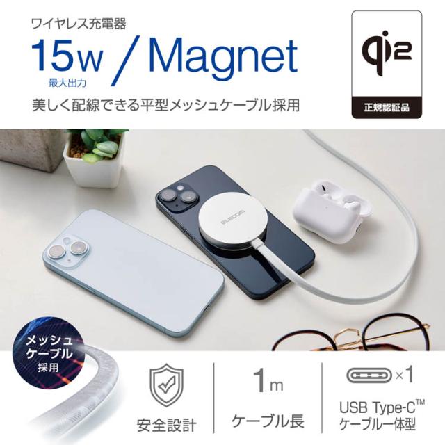 エレコム マグネット式ワイヤレス充電器 Qi2対応 平型メッシュ 1m シルバー(1個)[充電器・バッテリー類]