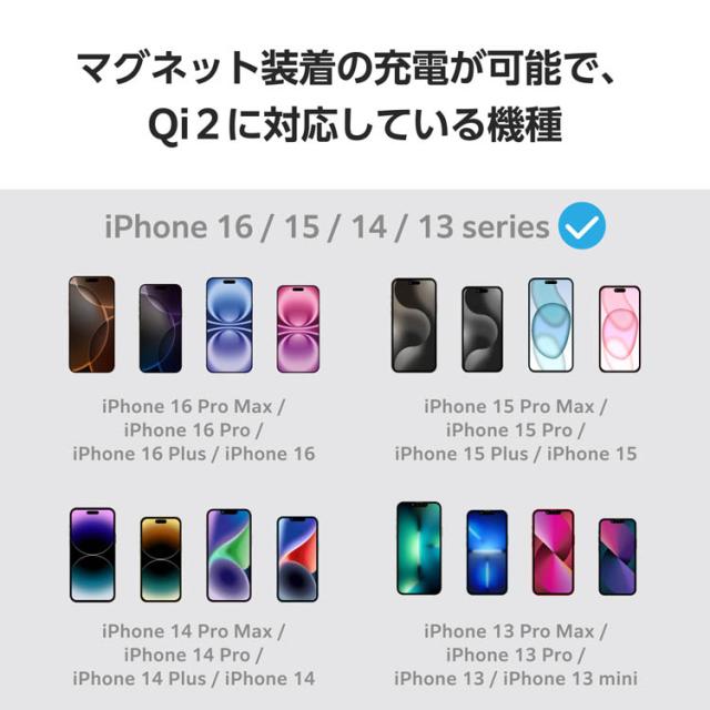 ●マグネットで固定するだけでQi2対応スマートフォンを高速充電できる、Qi2規格ワイヤレス充電スタンドです。最大出力15WでiPhoneを充電できます。