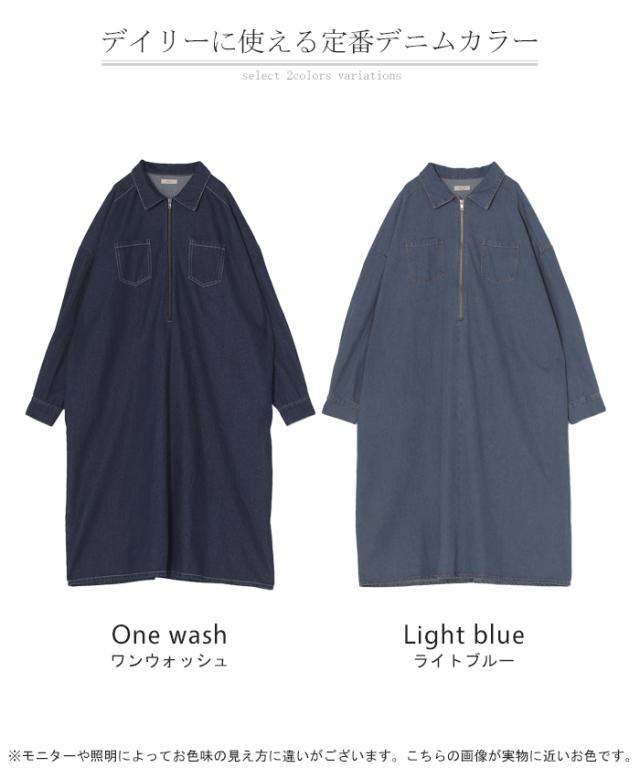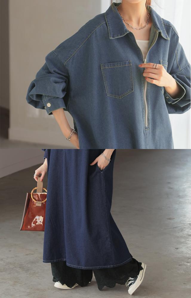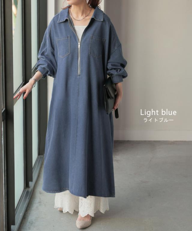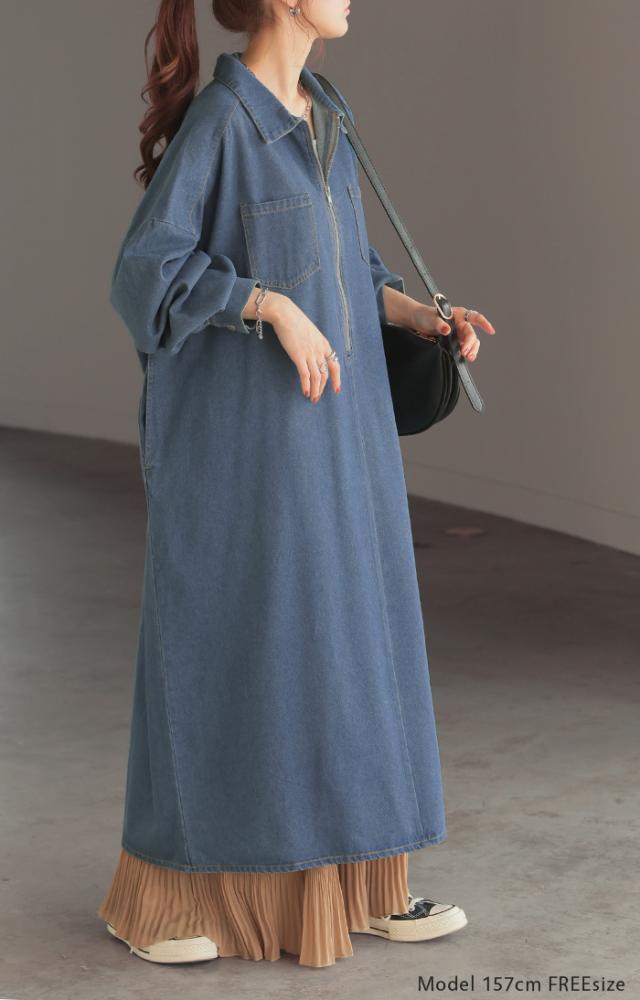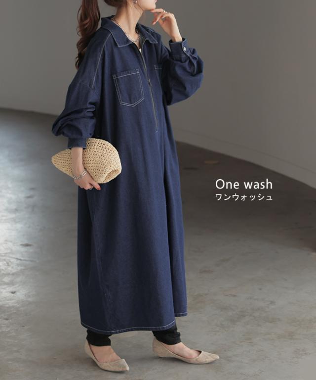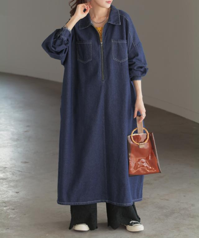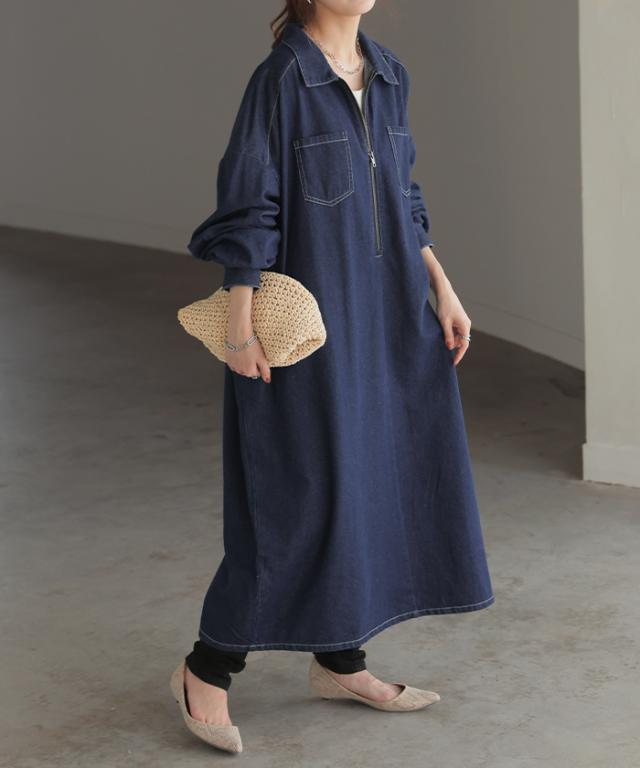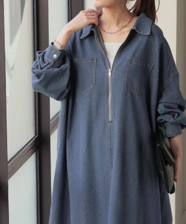 一枚でスタイリングが完成するハーフジップのデニムワンピースです。
