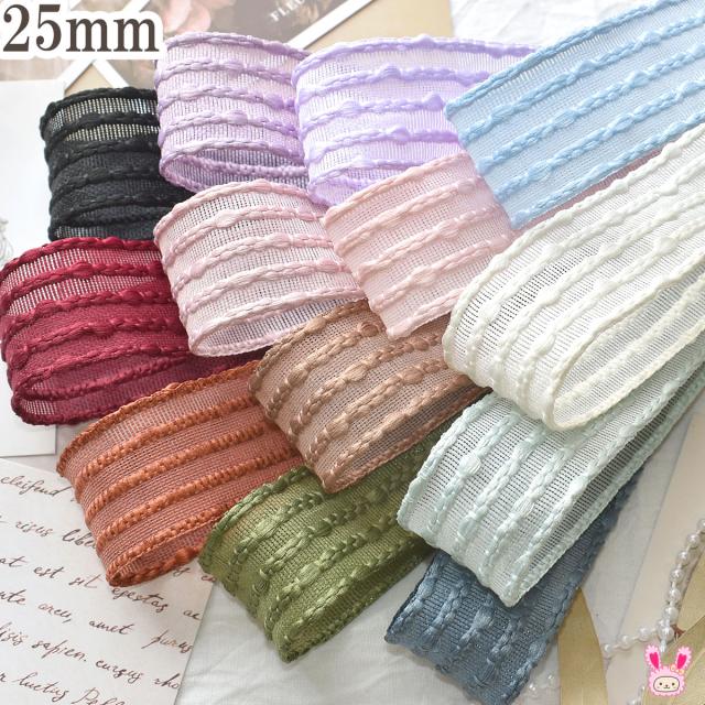 シースルー素材に、ポップコーンのようなぷっくりとしたステッチが可愛らしいリボン。5本のステッチが均等に並び、ストライプ模様のようなおしゃれなデザインになっています。もこもことした丸みのある質感が特徴で、ふんわりとした優しい雰囲気を演出。透明感があり軽やかな印象なので、春夏の作品作りにぴったりです。個性的なデザインが好きな方や、キュートなアクセントを加えたいハンドメイド作品におすすめです。