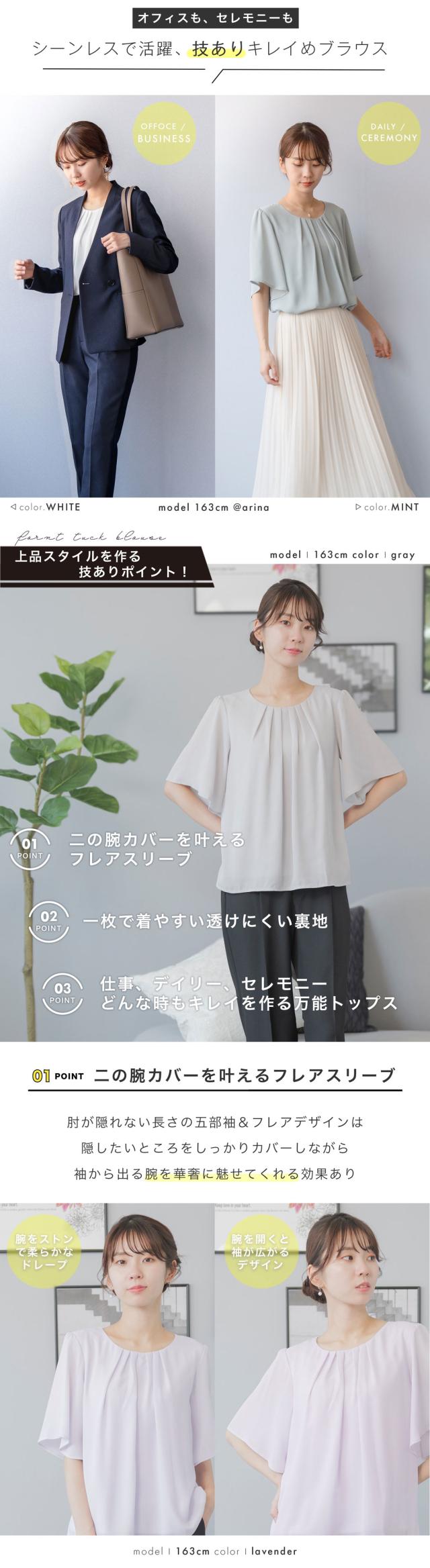 デイリーで使いやすい、工夫が詰まった上品なスタイルの半袖(5分袖)のフロントタックブラウス。二の腕カバーを叶えるフレアスリーブ。肘が隠れない長さの五部袖&フレアデザイン、腕を開くと袖が開くデザインは、隠したい二の腕をしっかりカバー。やわからなドレープのデザインで袖から出る腕を華奢に魅せてくれます。透けを気にせず一枚で着られる仕様。上見頃に裏地、袖に透け感を持たせて上品な印象