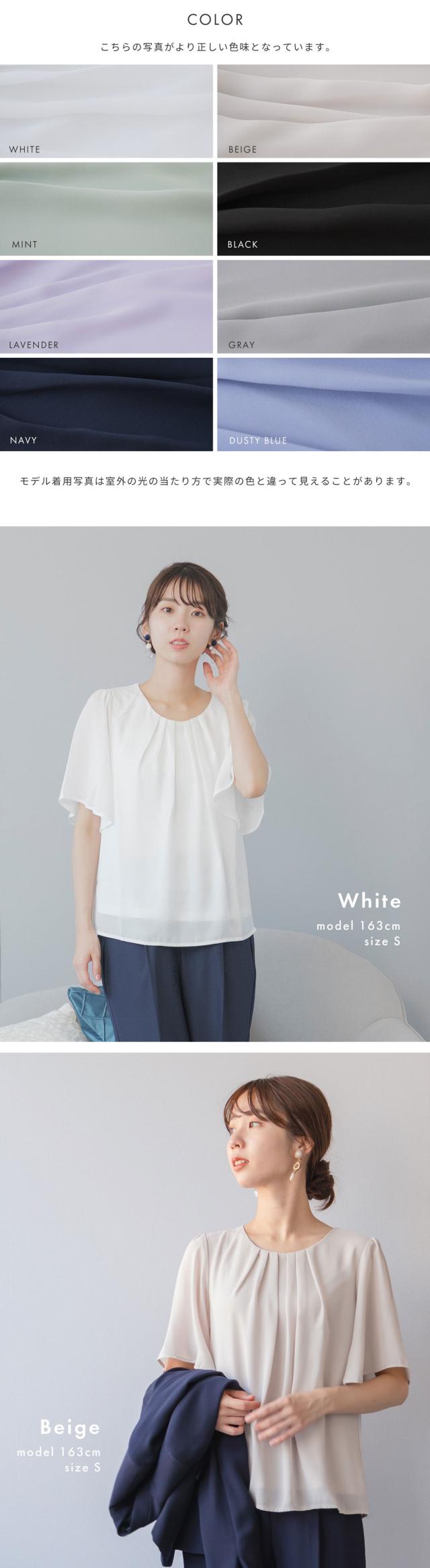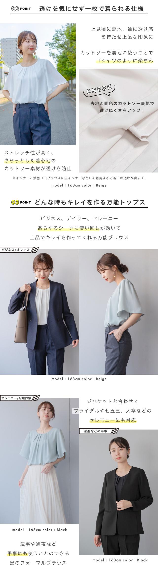 カットソーを裏地に使うことでTシャツのように楽な着心地、ストレッチ性の高いさらっとした着心地のカットソー素材が透けを防止してくれます※淡色のブラウスに濃色のインナーを着用すると若干の透けがでます。裾を外に出しても、トップスインでも、ビジネス・オフィス、デイリー、セレモニーあらゆるシーンに使い回しが効く上品でキレイを作ってくれる万能ブラウス