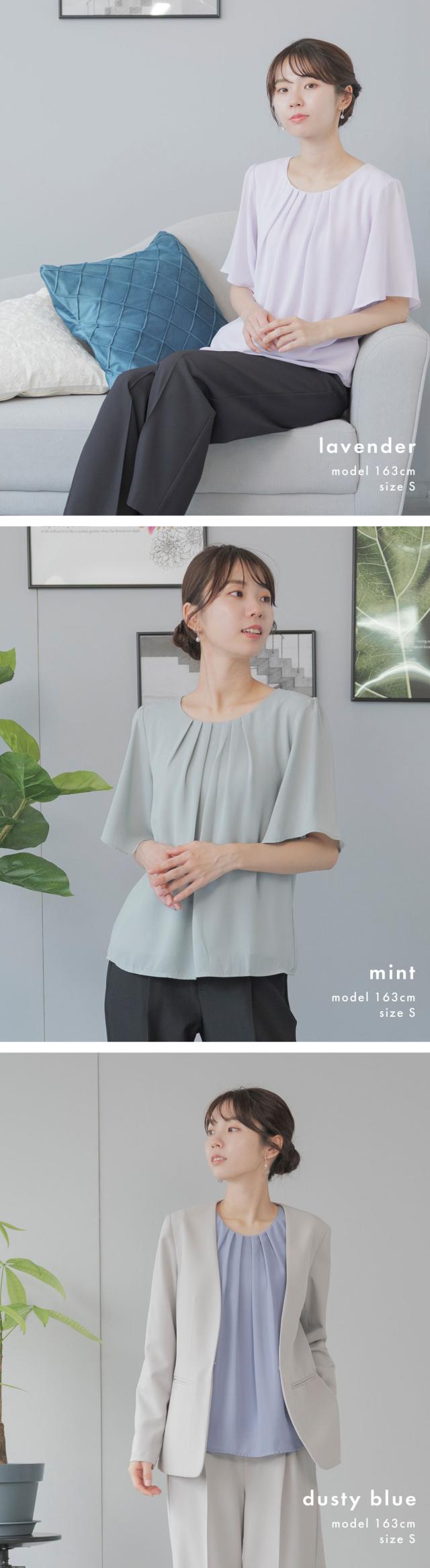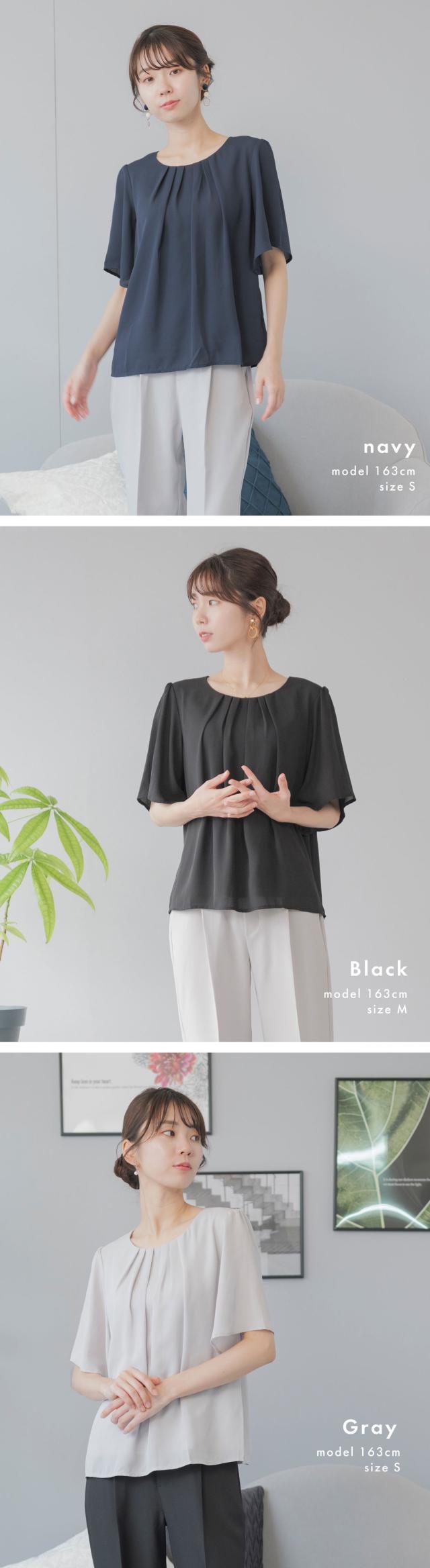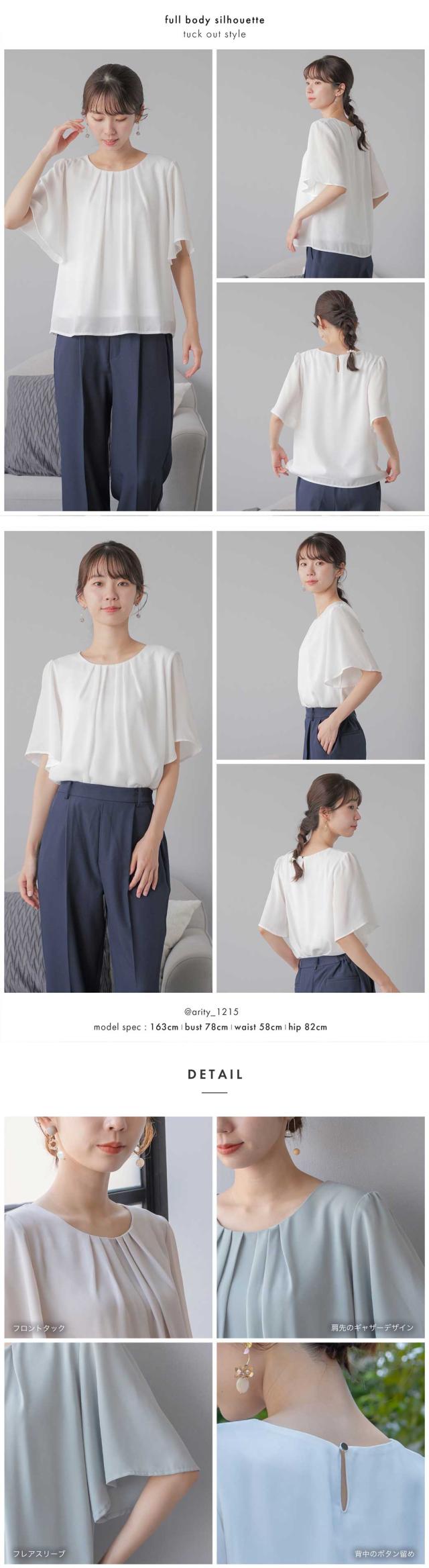 | 特徴 | デイリーで使いやすい、工夫が詰まった上品なスタイルの 半袖(5分袖)のフロントタックブラウス。 POINT 01 | 二の腕カバーを叶えるフレアスリーブ 肘が隠れない長さの五部袖&フレアデザイン 腕を開くと袖が開くデザインは、隠したい二の腕をしっかりカバー やわからなドレープのデザインで袖から出る腕を華奢に魅せてくれます POINT 02 | 透けを気にせず一枚で着られる仕様 上見頃に裏地、袖に透け感を持たせて上品な印象 カットソーを裏地に使うことでTシャツのように楽な着心地 ストレッチ性の高いさらっとした着心地のカットソー素材が透けを防止してくれます ※淡色のブラウスに濃色のインナーを着用すると若干の透けがでます POINT 03 | どんな時もキレイを作る万能トップス 裾を外に出しても、トップスインでも。 ビジネス・オフィス、デイリー、セレモニーあらゆるシーンに使い回しが効く 上品でキレイを作ってくれる万能ブラウス モデル:163cm 着用サイズ S |