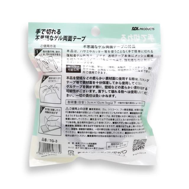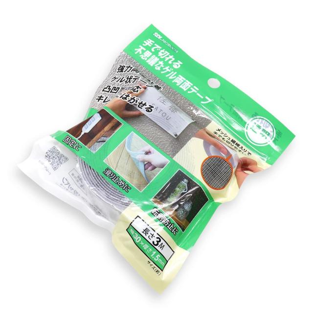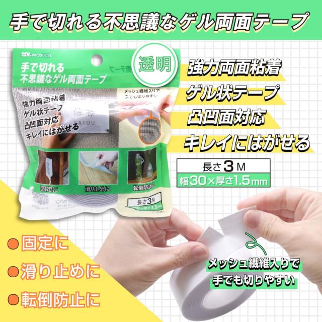 本品は、ハサミやカッター等を使うことなく手で簡単に切れる強粘着ゲル両面テープです。