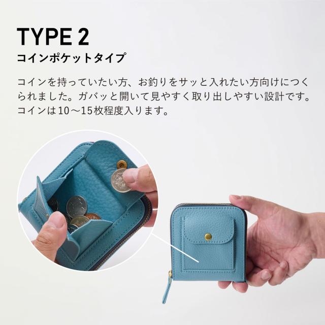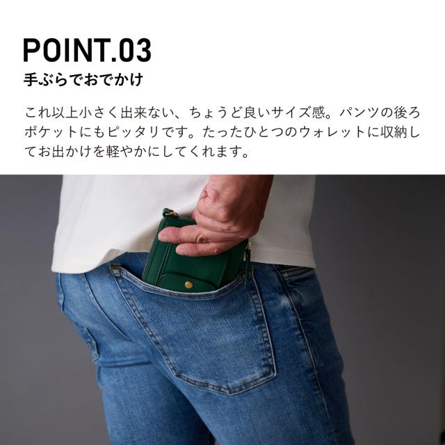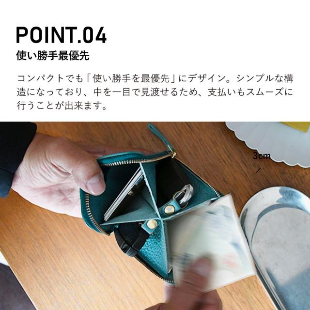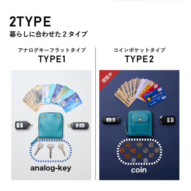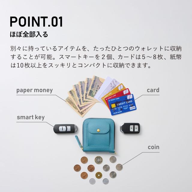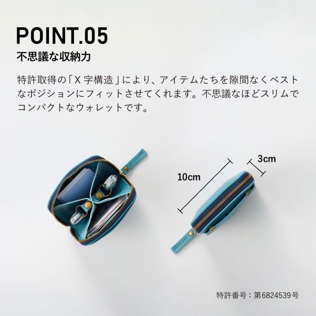 特許取得の「X字構造」が「ほぼ全部入る」を叶えます。スマートキー2個、カード、紙幣をコンパクトに収納。そして!「type2」では「小銭」も収納可能。ファスナーを開けずに小銭を出し入れ出来ます。「type1」を販売する中、たくさんのお客様から「小銭はどこに入れるの?」との声を多数いただき、その声にお応えする形でコインケースを搭載した「type2」を開発しました。小さすぎず、機能と使い勝手を最優先にデザイン。サイズは、パンツの後ろポケットにもちょうど良いおよそ10cm×10cm。シンプルな構造で、中を一目で見渡せるから、見つける、支払う、使う、しまうを一瞬で。小物いっぱいのストレスから解放。お手元に届いたその日からちょっと便利な暮らしが始まります。Dカンを標準装備しています。