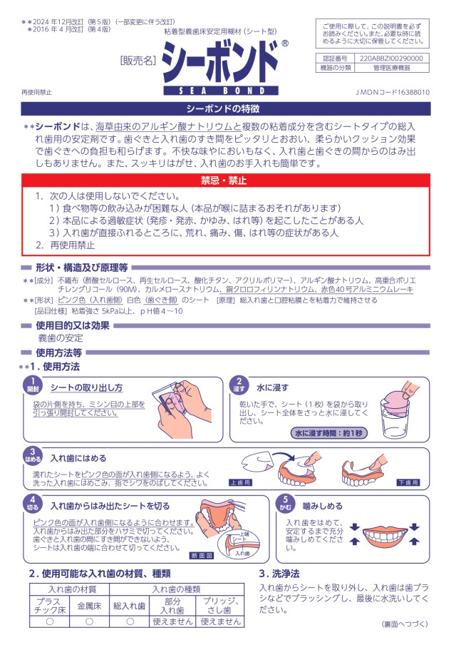 商品名 シーボンドネオ 上歯用・下歯用 30枚 ブランド シーボンド メーカー エーザイ 種類 上歯用、下歯用 容量 30枚入 成分 不織布(酢酸セルロース、再生セルロース、酸化チタン、アクリルポリマー)、アルギン酸ナトリウム、高重合ポリエチレングリコール(90M)、カルメロースナトリウム、銅クロロフィリンナトリウム、赤色40号アルミニウムレーキ 使用期限 商品の発送時点で、600日以上あるものをお届けいたします 使用方法 開封:袋の片側を持ち、ミシン目の上部を引っ張り開封してください。