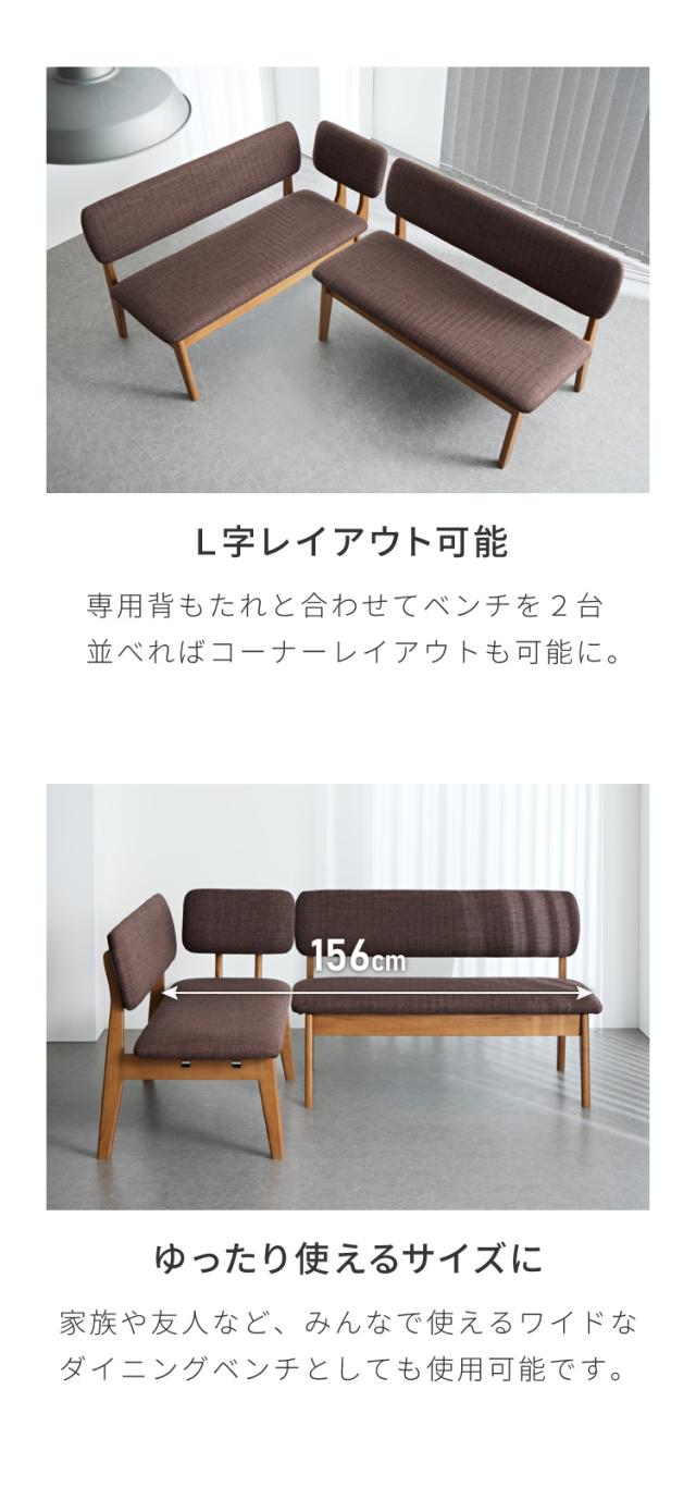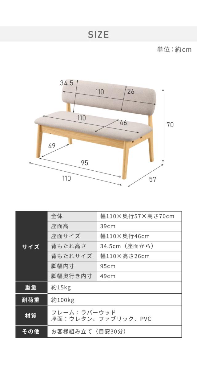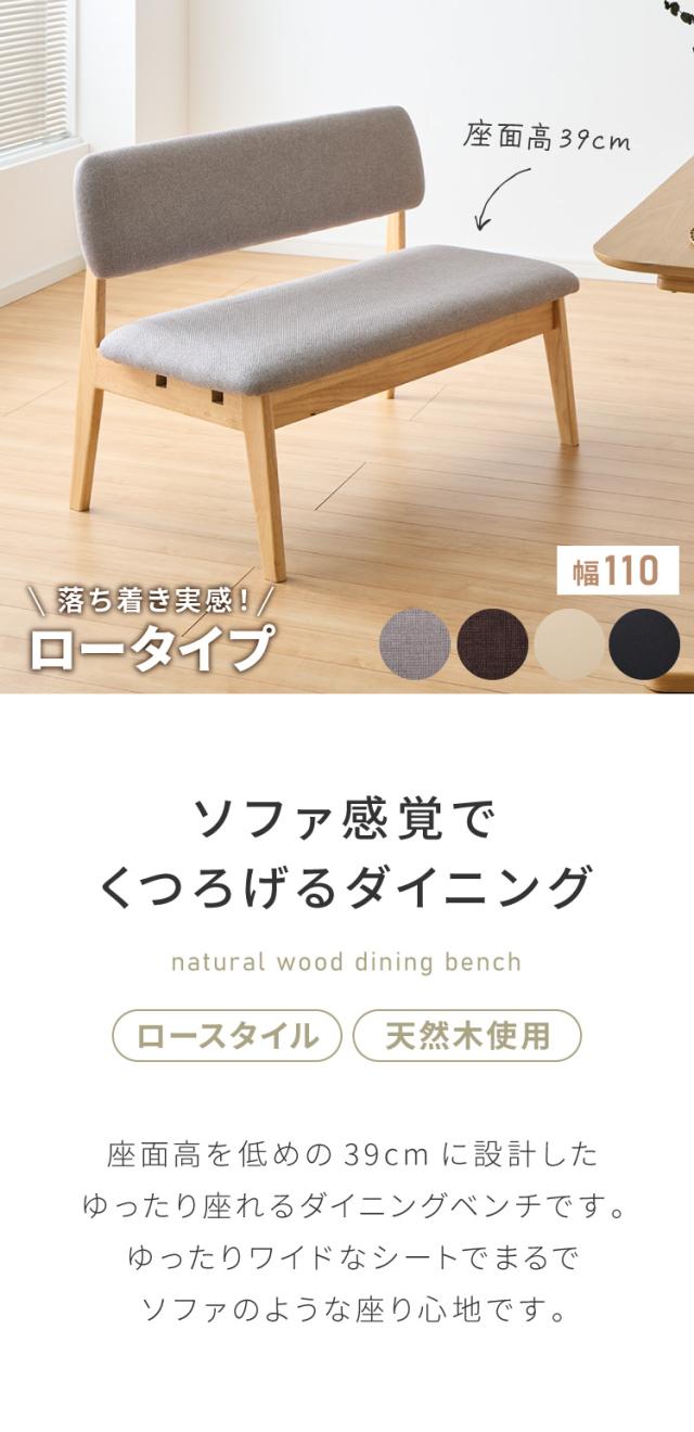 座面高39cm ゆったりダイニングベンチ 幅110 ベンチ ロータイプ 天然木 ファブリック ダイニング ベンチ 背もたれ 2人掛けベンチ 椅子 ダイニングチェア 食卓椅子 食卓チェア ナチュラル【送