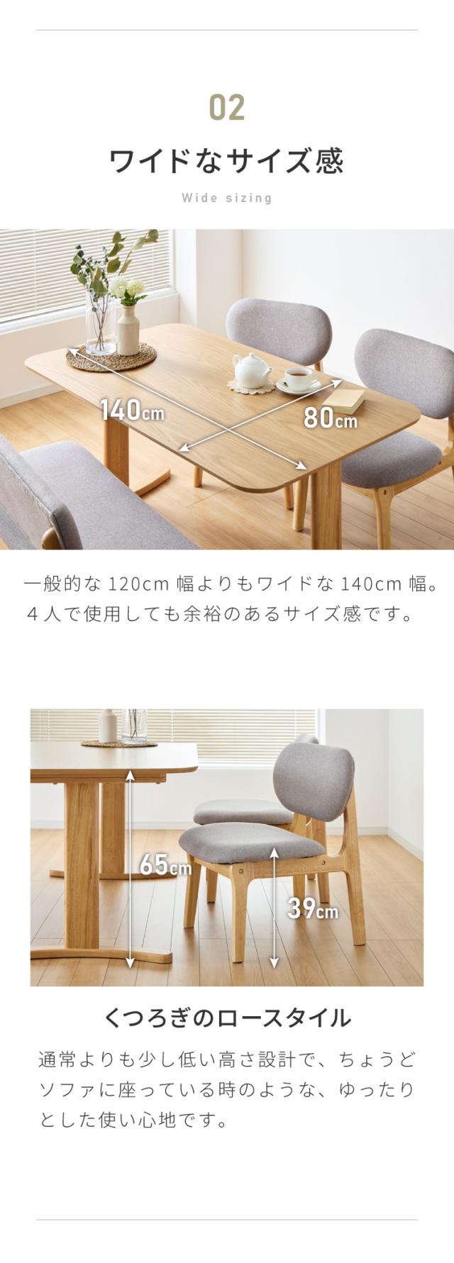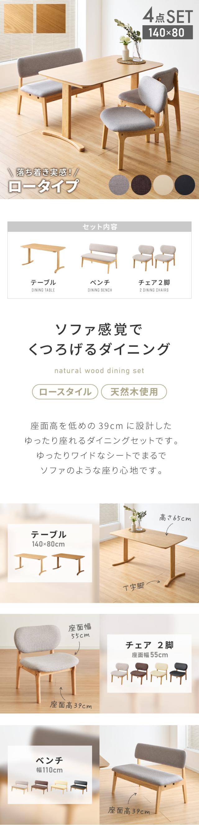 座面高39cm ゆったりダイニングチェア 4点セット 4人掛け 140×80cm ダイニングテーブル 高さ65cm 天然木 オーク突板 ダイニングセット ロータイプ ダイニングチェア ダイニングチェアー ナチュ