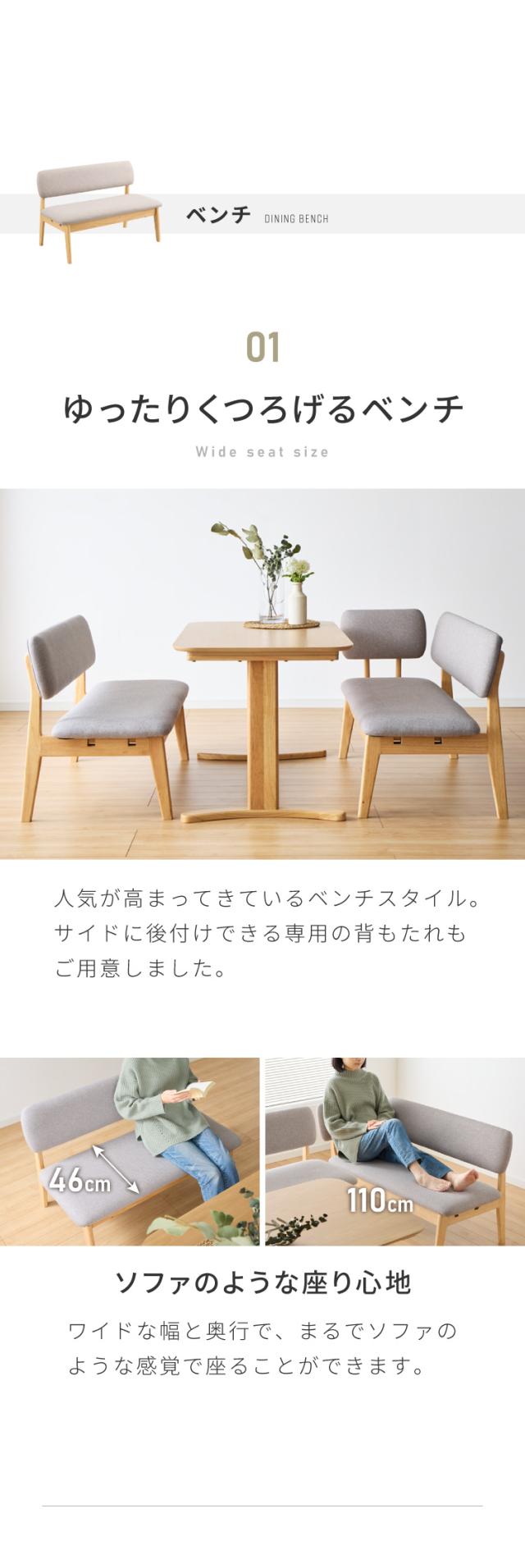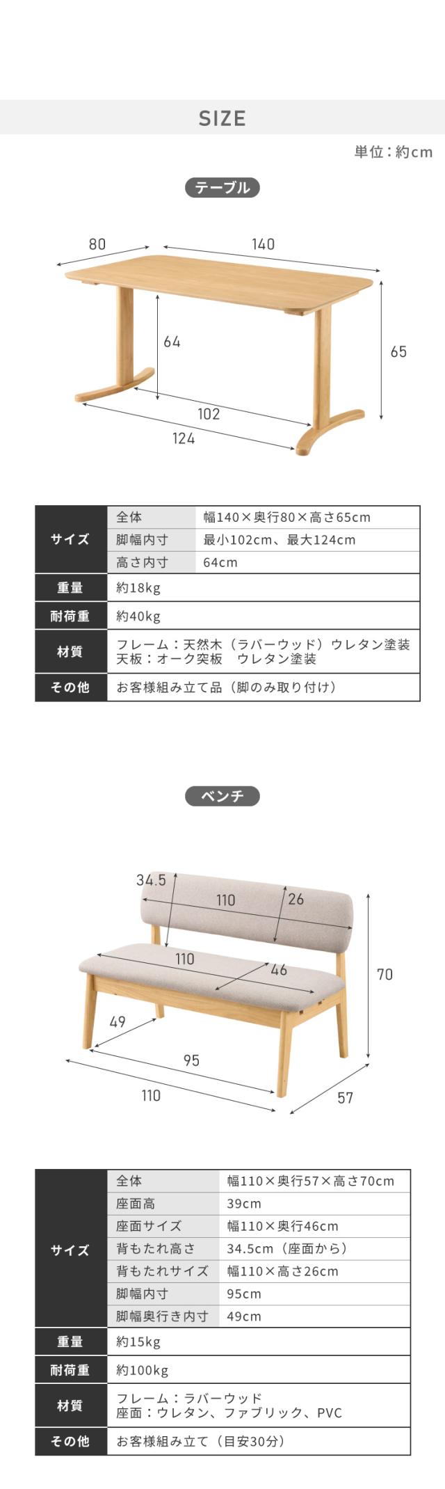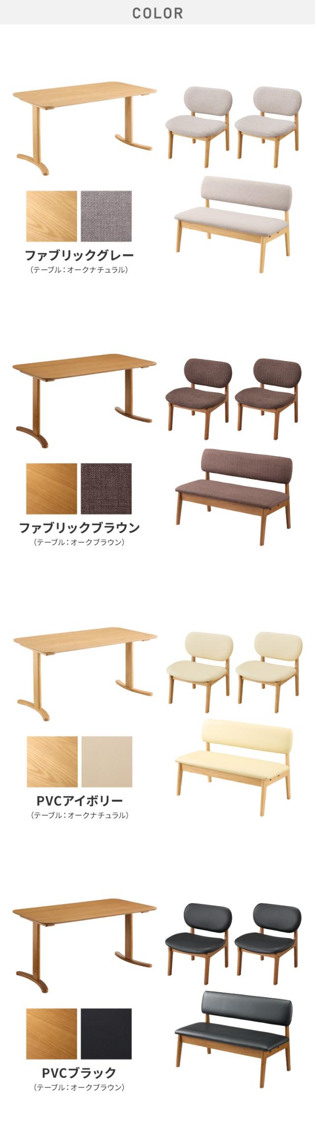 3点セット 幅110cmテーブル+チェア2脚 | 3点セット 幅110cmテーブル+ベンチ2脚 専用背もたれ付き | 4点セット 幅140cmテーブル+チェア2脚+ベンチ | |