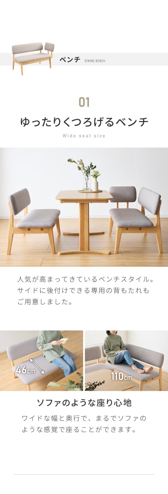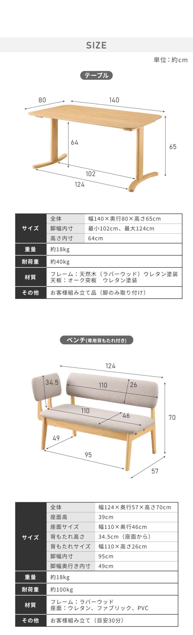 4点セット 幅140cmテーブル+チェア2脚+ベンチ 専用背もたれ付き