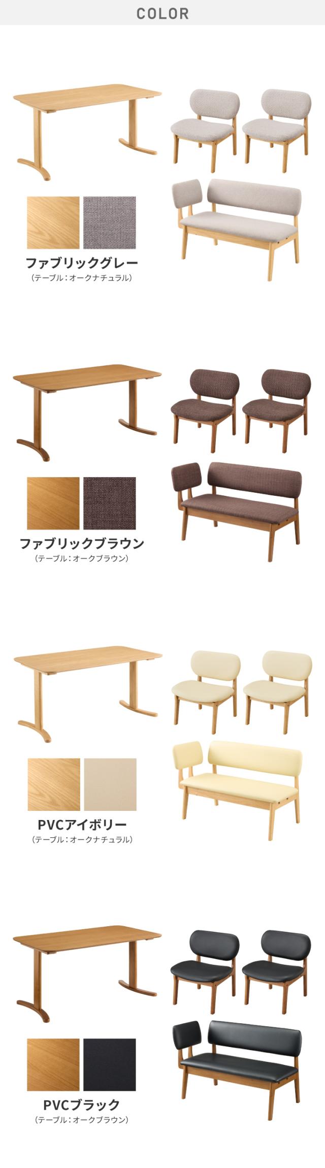 3点セット 幅110cmテーブル+チェア2脚 | 3点セット 幅110cmテーブル+ベンチ2脚 専用背もたれ付き | 4点セット 幅140cmテーブル+チェア2脚+ベンチ | |