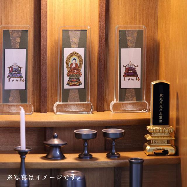 重厚感あふれるスタンド型デザインが特徴の、クリスタルガラス製掛軸です。本紙に描かれる繊細な絵像は和紙の縁取り、厳かな配色。お仏壇に置くだけで簡単に設置できるタイプです。