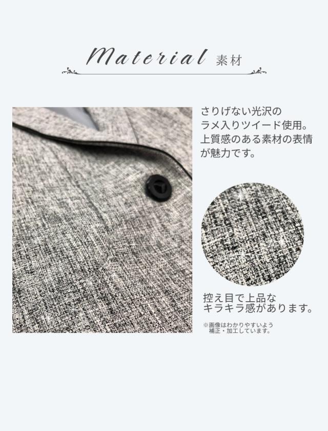 控え目な光沢のラメ糸入りツイード素材が上質感と上品さを兼ね備え、大人のフォーマルにふさわしい1着です。
