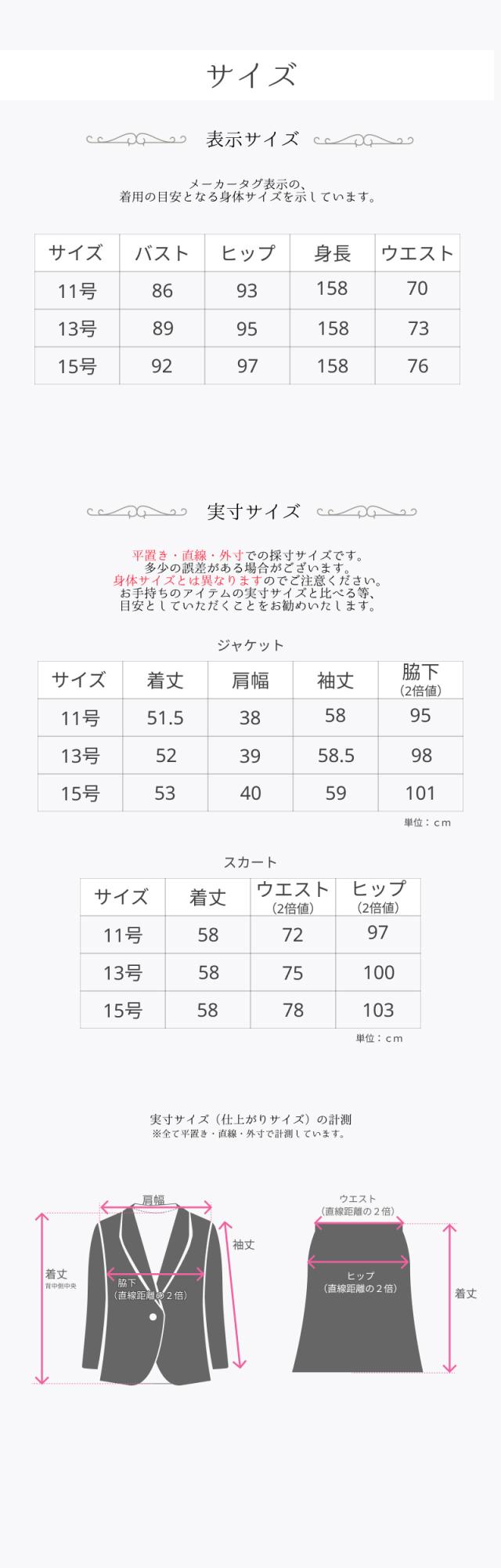 11号、13号、15号サイズのジャケット&スカートの2点セットスーツです。