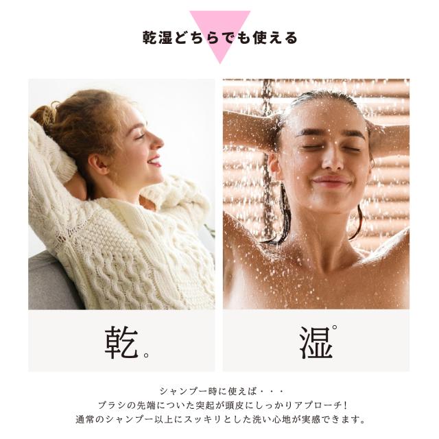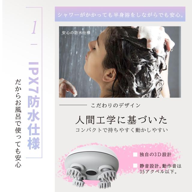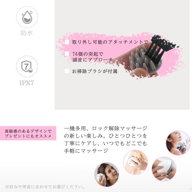 お肌に優しいシリコンブラシを採用、髪に絡まりにくくしっかり頭皮を揉み上げ、首や肩など気になるボディケアにもおすすめ。IP6級防水仕様、ブラシ取外し可能。防水等級規格IP66仕様でお風呂でも問題なく使用できる。シリコンブラシを取り外し可能、お手入れもラクラク。