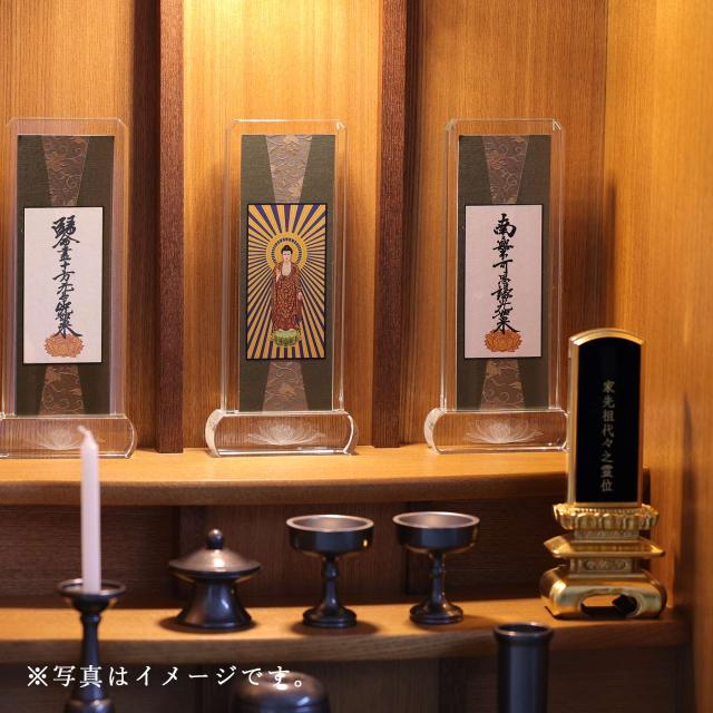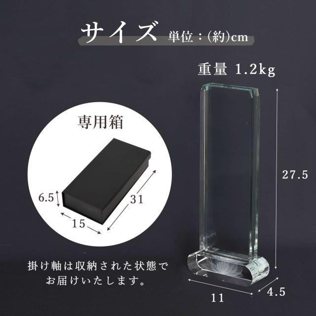 重厚感あふれるスタンド型デザインが特徴の、クリスタルガラス製掛軸です。本紙に描かれる繊細な絵像は和紙の縁取り、厳かな配色。お仏壇に置くだけで簡単に設置できるタイプです。