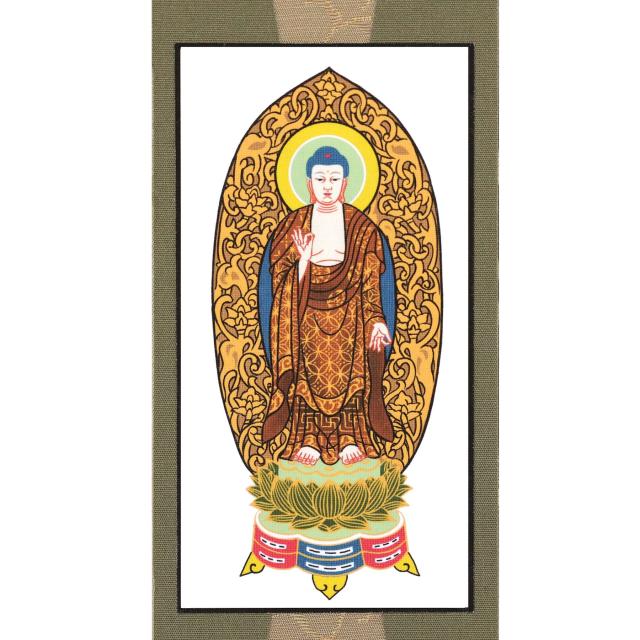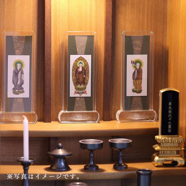 重厚感あふれるスタンド型デザインが特徴の、クリスタルガラス製掛軸です。本紙に描かれる繊細な絵像は和紙の縁取り、厳かな配色。お仏壇に置くだけで簡単に設置できるタイプです。